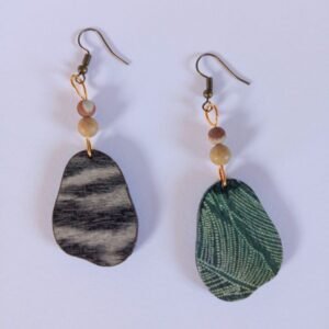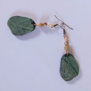 Κρεμαστά χειροποίητα σκουλαρίκια ελαφριά, από ξύλο και ημιπολύτιμους λίθους καφέ-μπεζ ίασπη σε αποχρώσεις του λαδί και καφέ. Η μπροστά πλευρά τους απεικονίζει φύλλο και είναι με τεχνική ντεκουπάζ. Η πίσω πλευρά τους έχει διαφορετικό σχέδιο.