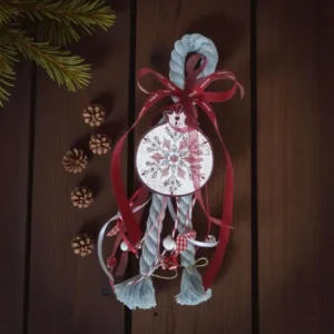 Κρεμαστό γούρι με ξύλινο ρόδι σαν κέντημα, με βυσινί σχέδια