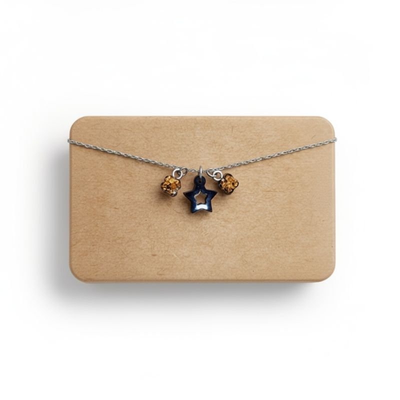 Αλυσίδα ποδιού με στοιχεία υγρού γυαλιού σε μαύρο με φύλλα χρυσού στα λουλούδια.