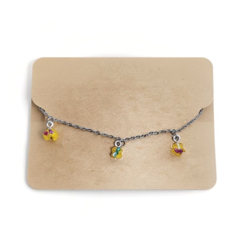 Αλυσίδα ποδιού με στοιχεία υγρού γυαλιού σε κίτρινο, μισοφέγγαρο, αστέρι και λουλούδι με πετρούλες μωβ και γαλάζιες.