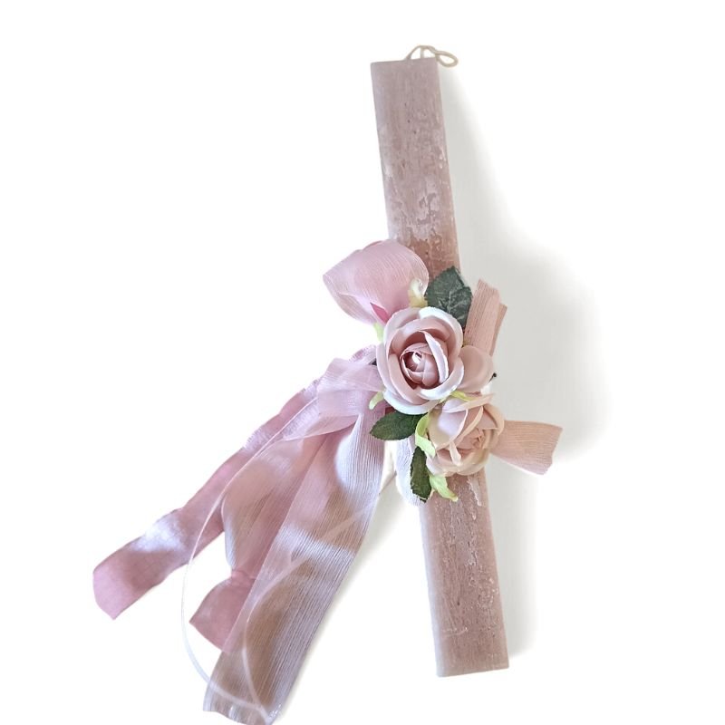 Πασχαλινή λαμπάδα 30 εκ. σε σάπιο μήλο, διακοσμημένη με λουλούδια και κορδέλες σε σάπιο μήλο και ροζ, σε ρομαντικό και κομψό στυλ.