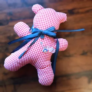 Βρεφικό γούρι για νεογέννητο αγοράκι, χαριτωμένο υφασμάτινο αρκουδάκι, φτιαγμένο από όμορφο κόκκινο καρό ύφασμα. Διακοσμημένο με κορδέλες και μια παραμάνα με ματάκι, είναι ιδανικό για το καλωσόρισμα του μικρού σας θησαυρού. Διαθέτει κορδέλα για να μπορεί να κρεμαστεί εύκολα, προσφέροντας προστασία και καλοτυχία.