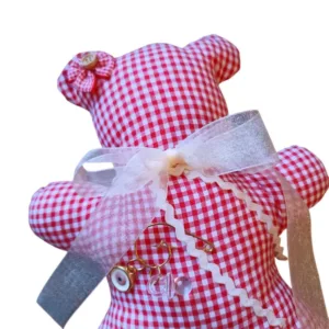 Βρεφικό γούρι για νεογέννητο κορίτσι, Αρκουδάκι. Φτιαγμένο από όμορφο κόκκινο καρό ύφασμα, διακοσμημένο με κορδέλες και παραμάνα με ματάκι για το καλωσόρισμα. Διαθέτει κορδέλα για να μπορεί να κρεμαστεί εύκολα.