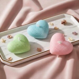 Μια τετράδα από μικρά, χαριτωμένα αρωματικά κεράκια σε σχήμα καπιτονέ καρδιάς σε διάφορα χρώματα, ροζ, γαλάζιο, βεραμάν, πράσινο κα. σε υπέροχα, διακριτικά αρώματα, καρύδας, τριαντάφυλλου, πασχαλιάς, θάλασσας.