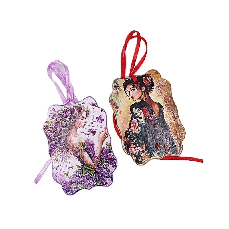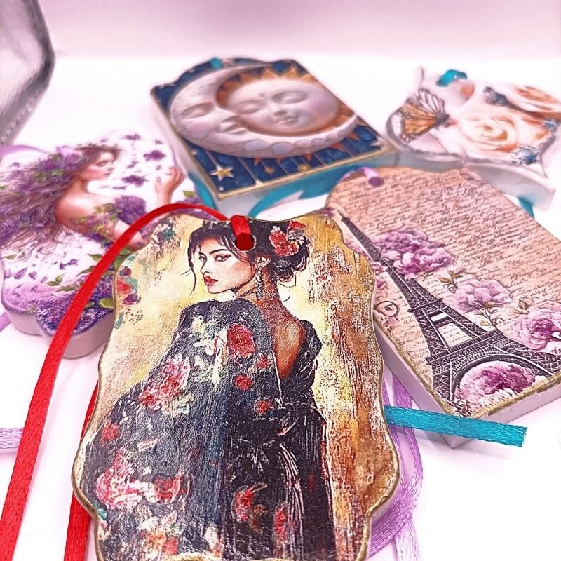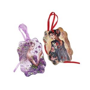 Πλακίδια πορσελάνινα διακοσμημένα με υπέροχες παραστάσεις και χρωματιστά κορδελάκια έτοιμα για κρέμασμα. Εμποτισμένα με αιθέριο έλαιο γλυκό Τριαντάφυλλο και τρυφερή Πούδρα αρωματίζουν το χώρο διακριτικά κι ευχάριστα. Επαναχρησιμοποιούνται όταν εξασθενήσει το άρωμα τοποθετώντας στο πίσω μέρος το άρωμα της αρεσκείας μας. Χρηστικά δωράκια για τα αγαπημένα μας πρόσωπα.