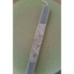 Αρωματική πλακέ λαμπάδα σε γκρι χρώμα διακοσμημένη με εφημερίδα και λευκά κουμπάκια .