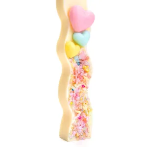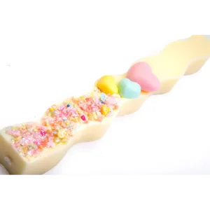 Αρωματική, κυματιστή, κίτρινη λαμπάδα με χρωματιστές καρδιές. Μια χαριτωμένη λαμπάδα με φωτεινά παστέλ ανοιξιάτικα χρώματα, ιδανική επιλογή για μικρά κορίτσια με απαλό άρωμα καρύδας και λάμψεις χρωματιστής χρυσόσκονη στις λεπτομέρειες!