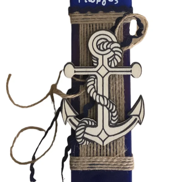 Μπλε αρωματική λαμπάδα 25 εκατοστά με εντυπωσιακό ξύλινο στοιχείο Άγκυρα. Η λαμπάδα έχει υπέροχο άρωμα.