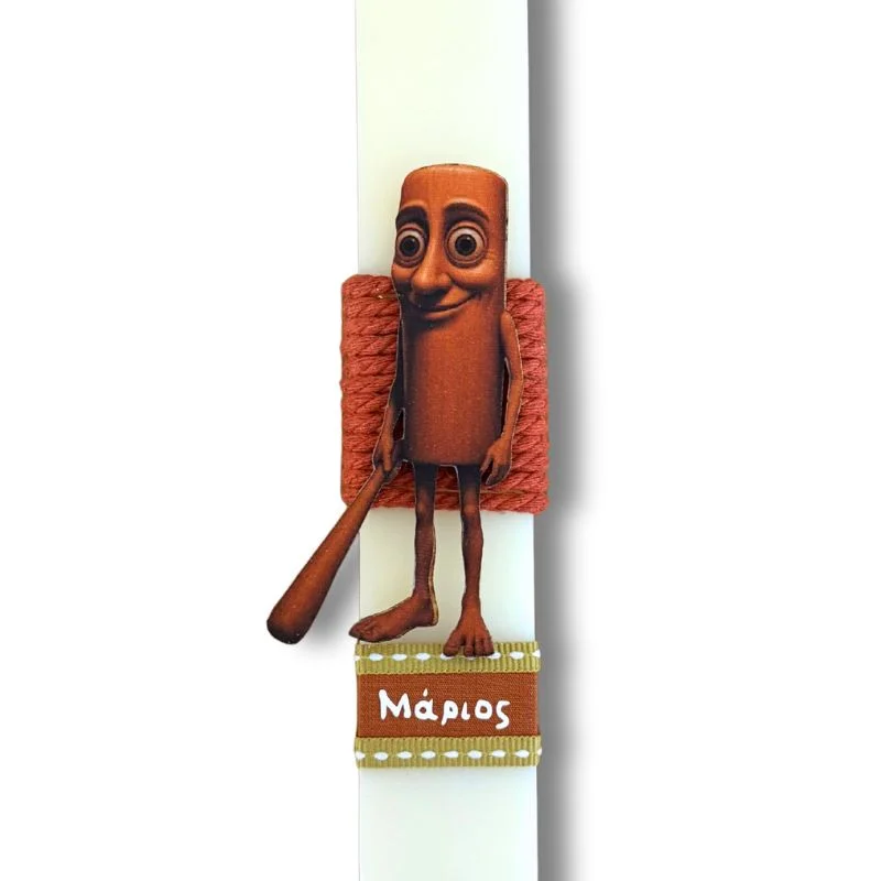 Εκρού αρωματική λαμπάδα 24 εκατοστά με εντυπωσιακό ξύλινο στοιχείο Tung Tun Tung Sahur – Steal a Brainrot με όνομα.