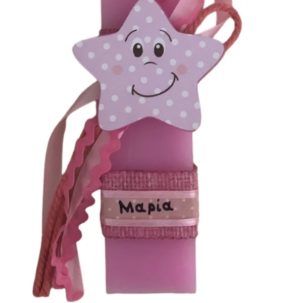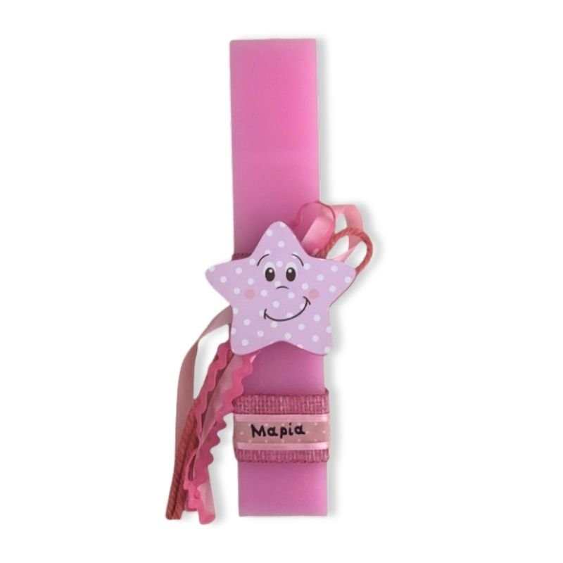 Αρωματική ροζ λαμπάδα 25 εκατοστά με εντυπωσιακό ξύλινο στοιχείο Αστέρι. Η λαμπάδα έχει υπέροχο άρωμα.