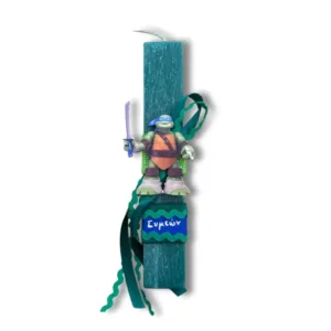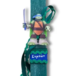 Πράσινη αρωματική λαμπάδα 23 εκατοστά με εντυπωσιακό ξύλινο στοιχείο Χελωνονιντζάκι με όνομα.
