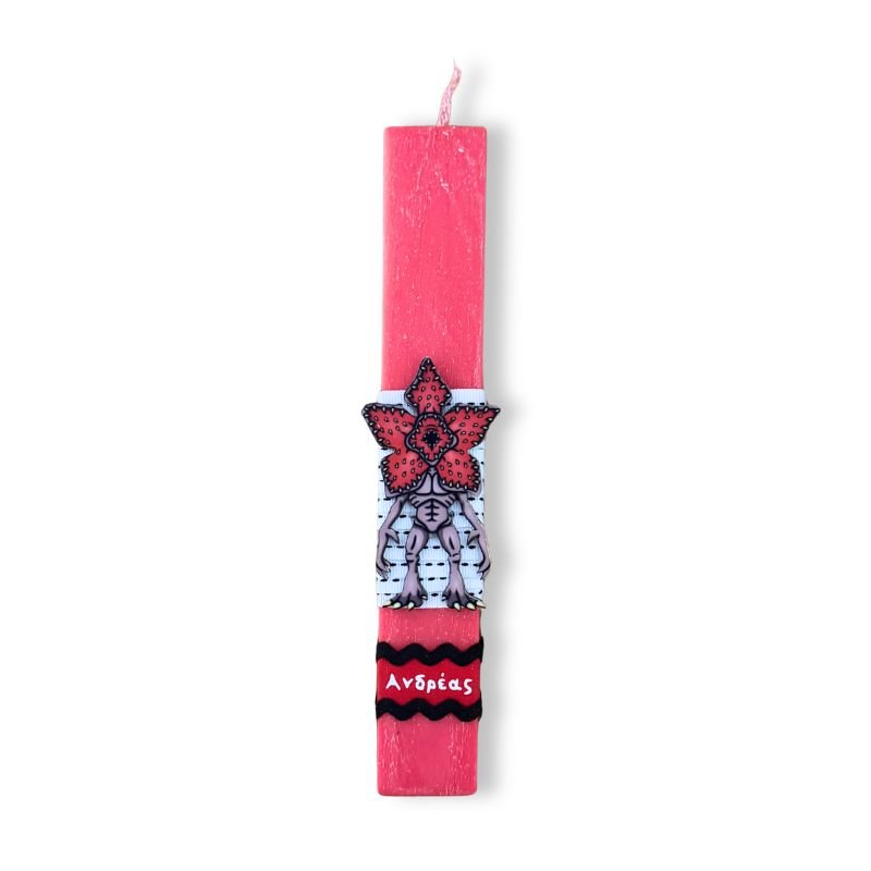 Κόκκινη αρωματική λαμπάδα 23 εκατοστά με εντυπωσιακό ξύλινο στοιχείο Demogorgon με όνομα.