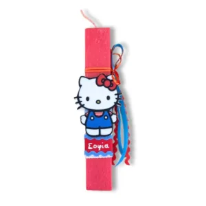 Κόκκινη αρωματική λαμπάδα 23 εκατοστά με εντυπωσιακό ξύλινο στοιχείο γατούλα Hello Kitty με όνομα.