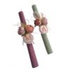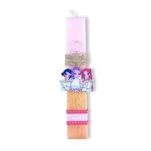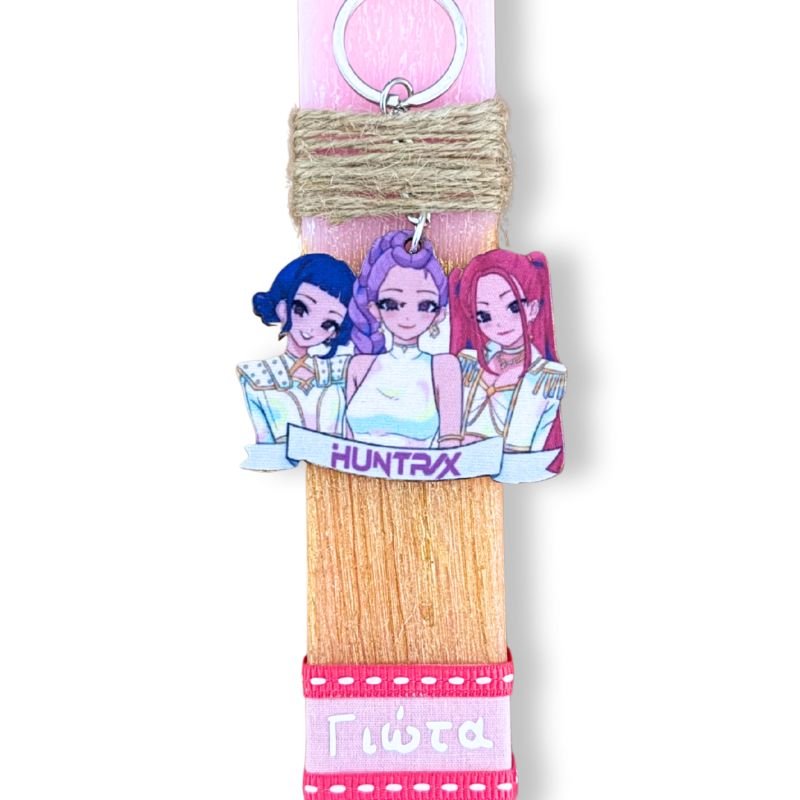 Δίχρωμη ροζ – χρυσή αρωματική λαμπάδα 23 εκατοστά με εντυπωσιακό ξύλινο μπρελόκ Huntrix – Kpop Demon Hunters με όνομα.