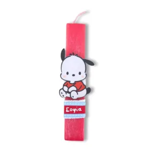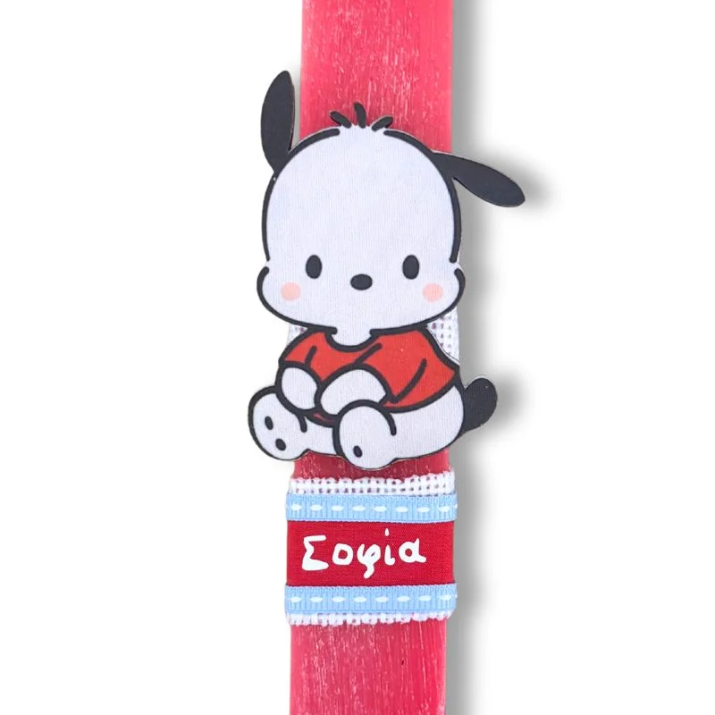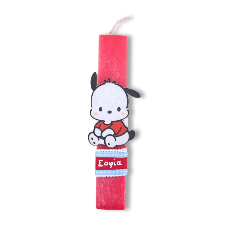 Κόκκινη αρωματική λαμπάδα 23 εκατοστά με εντυπωσιακό ξύλινο στοιχείο σκυλάκι Pochacco με όνομα.