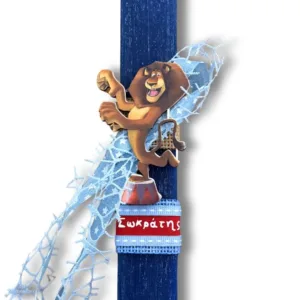 Μπλε αρωματική λαμπάδα 23 εκατοστά με εντυπωσιακό ξύλινο στοιχείο Λιοντάρι Μαδαγασκάρη με όνομα.