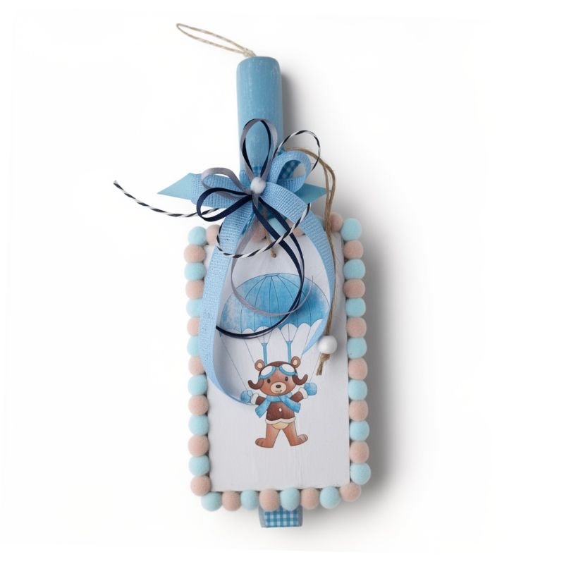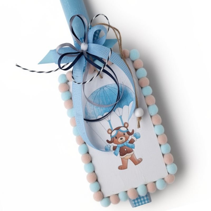 Αρωματική πλακέ λαμπάδα διακοσμημένη με ένα ξύλινο ταμπελάκι και ένα αλεξιπτωτιστή αρκουδάκι. Το ταμπελάκι γύρω του έχει πομ πομ σε γαλάζιο και μπεζ χρώμα που ταιριάζει απόλυτα με την λαμπάδα.