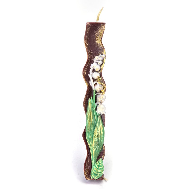Κυματιστή, αρωματική λαμπάδα με λευκά, ανάγλυφα, κέρινα λουλουδάκια και πράσινο φύλλωμα σε χρώμα σκούρο καφέ.