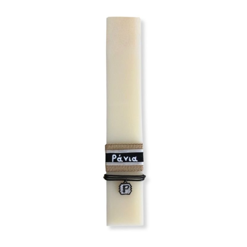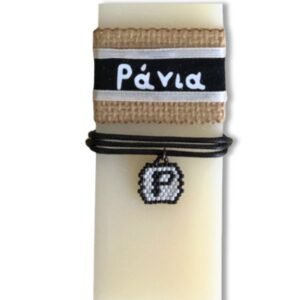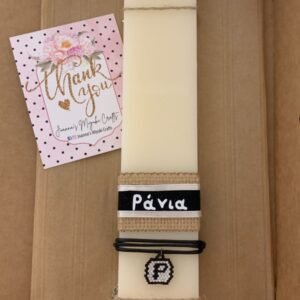 Αρωματική λαμπάδα 25 εκατοστά με μενταγιόν Miyuki Μονόγραμμα και με το όνομα πάνω στη λαμπάδα. Το μενταγιόν είναι χειροποίητο, κεντημένο στο χέρι με το Μονόγραμμα που θα επιλέξετε.