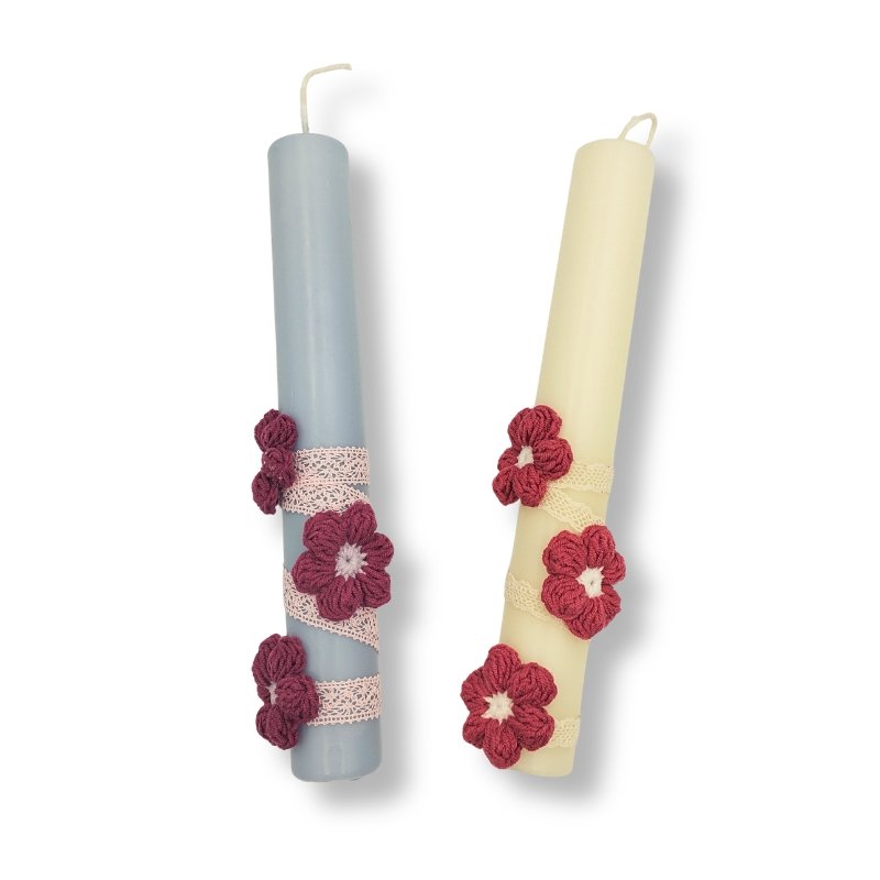 Πασχαλινή αρωματική λαμπάδα με χειροποίητα πλεκτά λουλούδια, σε στρογγυλή λαμπάδα. Είναι διαθέσιμη σε δύο αποχρώσεις, γκρι λαμπάδα με βυσσινή λουλούδια και μπεζ λαμπάδα με κόκκινα λουλούδια, για να διαλέξετε αυτό που σας ταιριάζει.