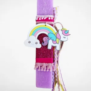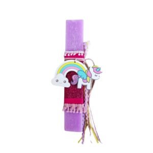 Χειροποίητη αρωματική λαμπάδα με ξύλινο διακοσμητικό Ουράνιο Τόξο με Μονόκερο.