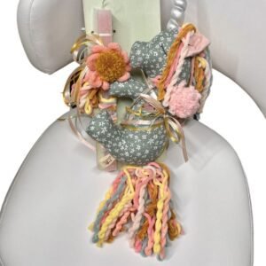 Ο μονόκερος είναι ραμμένος από εμπριμέ βαμβακερό ύφασμα σε σκούρο βεραμάν χρώμα με λευκά λουλούδια, ενώ τα μαλλιά και η ουρά του είναι από βελουτέ νήμα σε παστέλ αποχρώσεις.