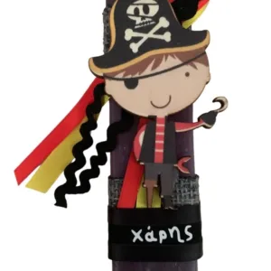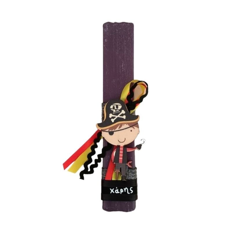 Αρωματική λαμπάδα 23 εκατοστά με εντυπωσιακό ξύλινο στοιχείο Πειρατής. Η λαμπάδα έχει υπέροχο άρωμα.