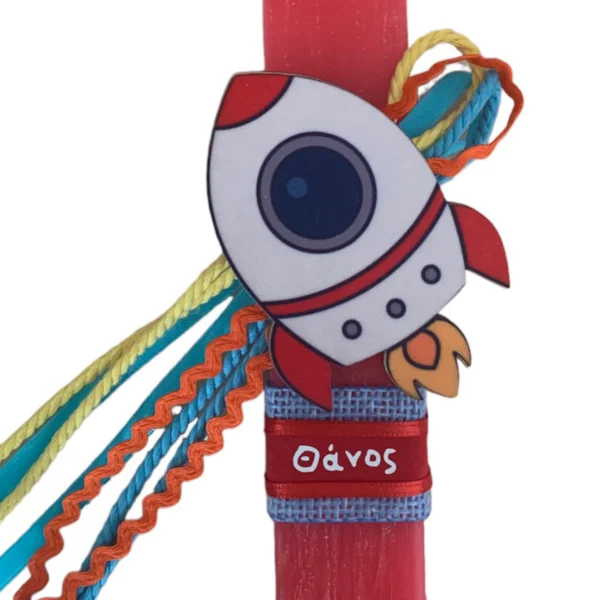 Αρωματική λαμπάδα 23 εκατοστά με εντυπωσιακό ξύλινο στοιχείο Πύραυλος. Η λαμπάδα έχει υπέροχο άρωμα.