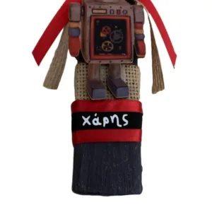 Μαύρη ξυστή αρωματική λαμπάδα 24 εκατοστά με εντυπωσιακό ξύλινο στοιχείο ρομπότ. Η λαμπάδα έχει υπέροχο άρωμα.