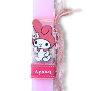 Ροζ αρωματική λαμπάδα 25 εκατοστά με εντυπωσιακό ξύλινο στοιχείο My Melody από την ταινία Stitch με όνομα.