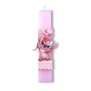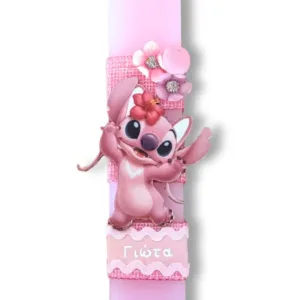 Ροζ αρωματική λαμπάδα 25 εκατοστά με εντυπωσιακό ξύλινο στοιχείο Angel από την ταινία Stitch με όνομα.