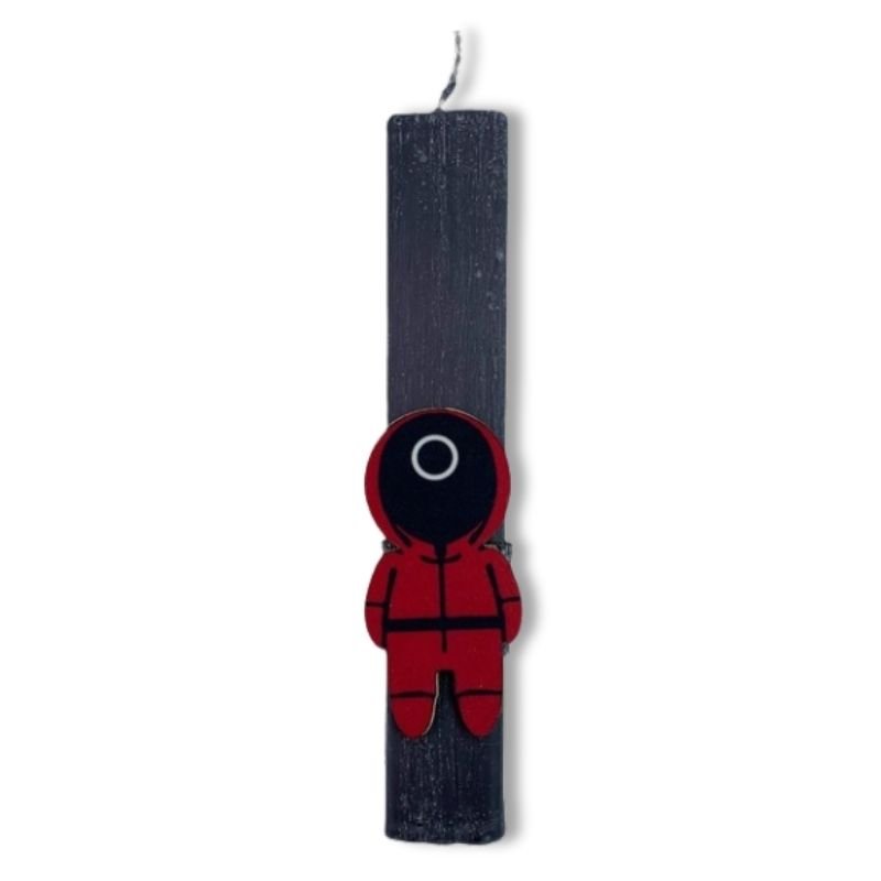 Αρωματική λαμπάδα 23 εκατοστά με εντυπωσιακό ξύλινο στοιχείο Squid Game. Η λαμπάδα έχει υπέροχο άρωμα.