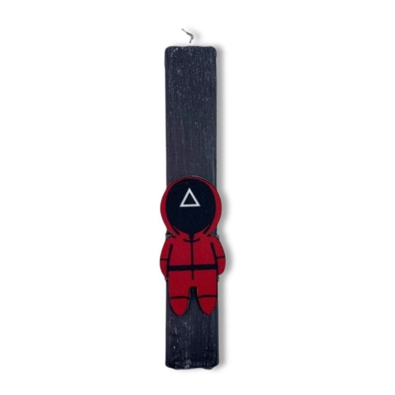 Αρωματική λαμπάδα 23 εκατοστά με εντυπωσιακό ξύλινο στοιχείο Squid Game. Η λαμπάδα έχει υπέροχο άρωμα.