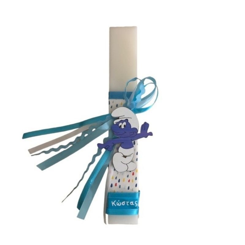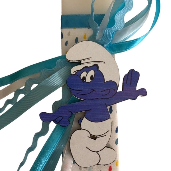 Λευκή αρωματική λαμπάδα 25 εκατοστά με εντυπωσιακό ξύλινο στοιχείο Στρουμφάκι. Η λαμπάδα έχει υπέροχο άρωμα.