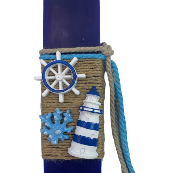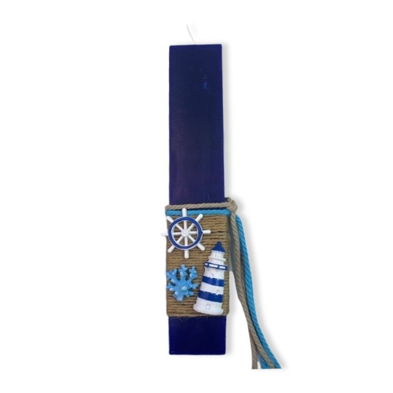 Μπλε αρωματική λαμπάδα 25 εκατοστά με εντυπωσιακά κεραμικά στοιχεία με θέμα τη θάλασσα. Η λαμπάδα έχει υπέροχο άρωμα.