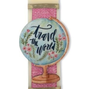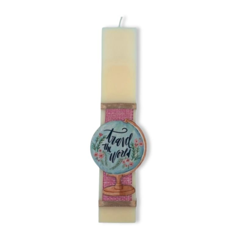 Εκρού αρωματική λαμπάδα 25 εκατοστά με εντυπωσιακό ξύλινο στοιχείο Υδρόγειος. Η λαμπάδα έχει υπέροχο άρωμα.