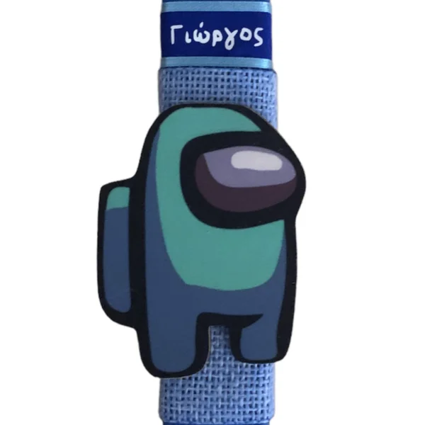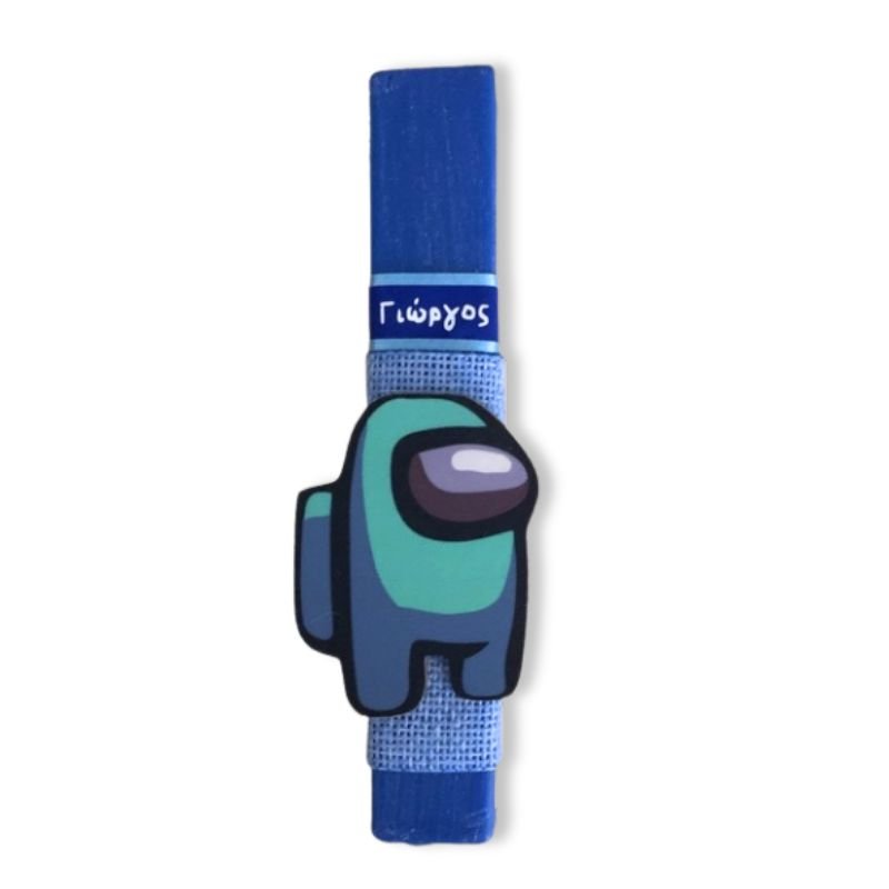 Αρωματική λαμπάδα 23 εκατοστά με εντυπωσιακό ξύλινο στοιχείο Ζουν Ανάμεσά μας Among us – μπλε. Η λαμπάδα έχει υπέροχο άρωμα.