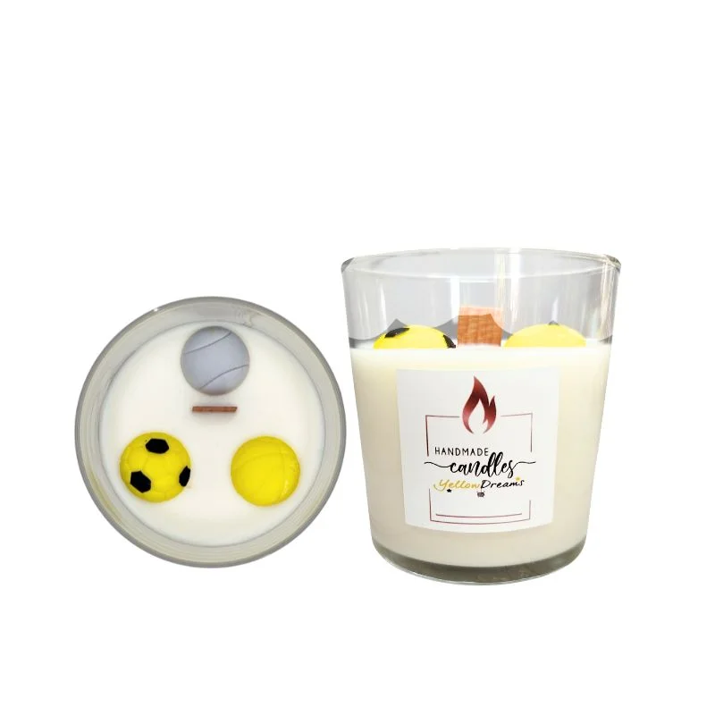 Κερί διακοσμημένο με 3 αθλητικές μπάλες, από φυτικό 100% κερί σόγιας, σε άρωμα της επιλογής σας!!!