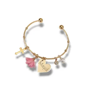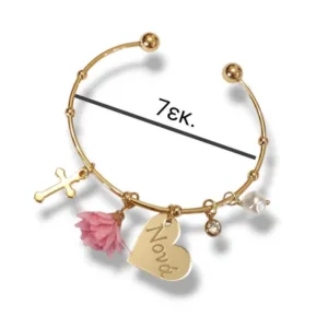 Ατσάλινες επιχρυσωμένες χειροπέδες, μαρτυρικά για τη μαμά και τη νονά, με ροζ υφασμάτινο φουντάκι, στρασάκι και πέρλα. Ο σταυρός είναι ορειχάλκινος με επιχρύσωση 24k. Η καρδιά είναι πλέξιγκλας χρυσός καθρέφτης.