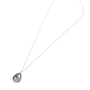 Κομψό ατσάλινο memory locket κολιέ σε σχήμα δάκρυ, με διάφανο γυάλινο τζάμι και διακοσμητικά μπλε πέτρες και λεπτό χρυσό φύλλο στο εσωτερικό.