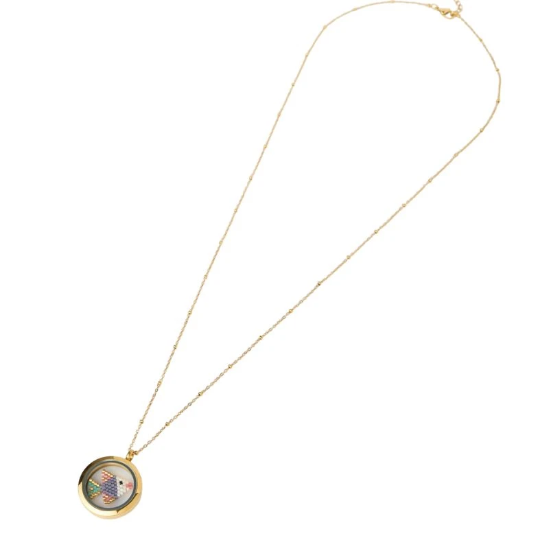 Χειροποίητο ατσάλινο memory locket κολιέ με διάφανο γυάλινο τζάμι και διακοσμητικό ψάρι από χάντρες Miyuki σε παστέλ αποχρώσεις.