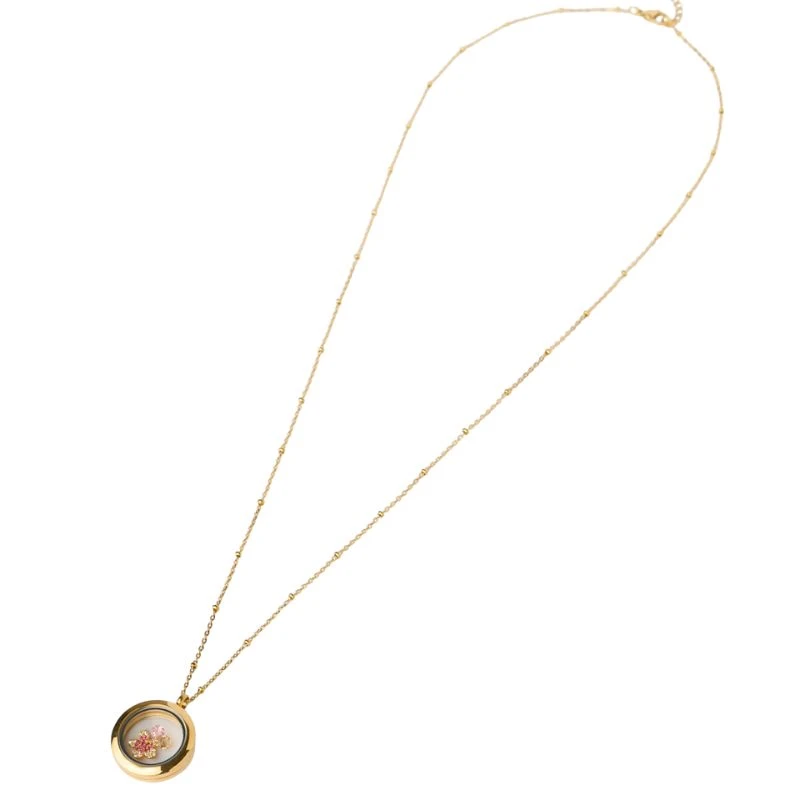 Χειροποίητο ατσάλινο memory locket κολιέ με διάφανο γυάλινο τζάμι και διακοσμητικό ροζ λουλούδι στο εσωτερικό.