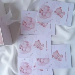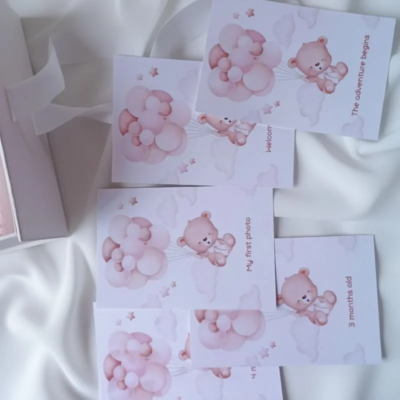 - 12 κάρτες milestone, μία για κάθε μήνα ζωής (1ος–12ος μήνας), με ρομαντική κοριτσίστικη αισθητική και χώρο για μικρές σημειώσεις, ημερομηνίες και σκέψεις των γονιών. Οι κάρτες είναι ιδανικές για φωτογράφιση αλλά και για φύλαξη ως ενθύμιο.