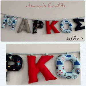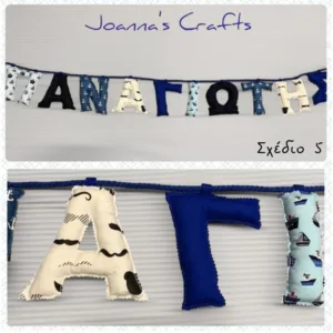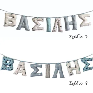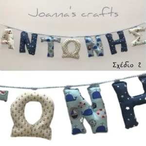 Απλά διαλέξτε τον συνδυασμό της αρεσκείας σας και γράψτε το όνομα του παιδιού στο αντίστοιχο πεδίο με κεφαλαία γράμματα. Το όνομα που θέλετε θα γίνει με τον συνδυασμό υφασμάτων του προτύπου που θα επιλέξετε.