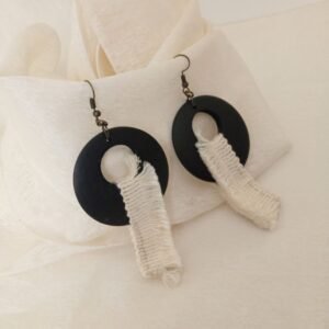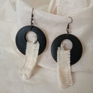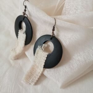 Σκουλαρίκια κρεμαστά κρίκοι από ξύλο σε μαύρο χρώμα με εκρού τρέσα, σε στυλ boho. Κρέμονται από γαντζάκι σε μπρονζέ χρώμα.