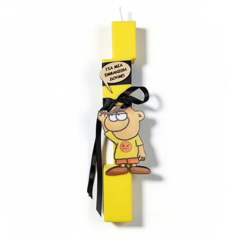 Χειροποίητη κίτρινη αρωματική Λαμπάδα με τον Θανασάκη με την επιγραφή “Για μια εμφάνιθη δουμε”.