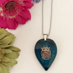 Μενταγιόν εξ’ολοκλήρου χειροποίητο από υγρό γυαλί με μεταλλική κουκουβάγια. Διαστάσεις στοιχείου 4 Χ 2,50 εκατοστά.