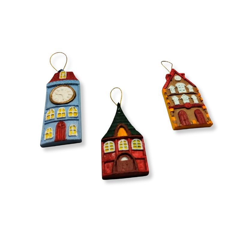 Ένα ιδιαίτερο σετ στολιδιών σπιτάκια κατασκευασμένα από πορσελάνη ιδανικά για να δώσουν κάτι στην εορταστική ατμόσφαιρα του σπιτιού. Βαμμένα με ακρυλικά και βερνίκι gloss.