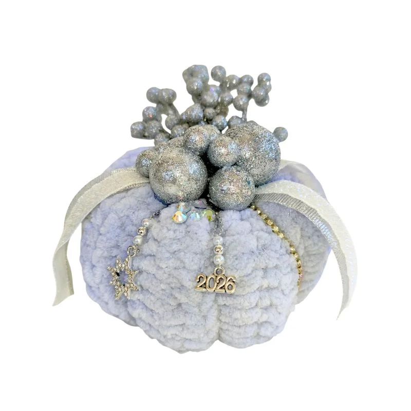 Πλεκτή βελούδινη κολοκύθα, ιδιαίτερα απαλή, σε γαλάζιο, στολισμένη με ασημί μπαλίτσες, ασημί κορδέλες, και μεταλλικό 2026.