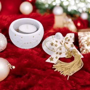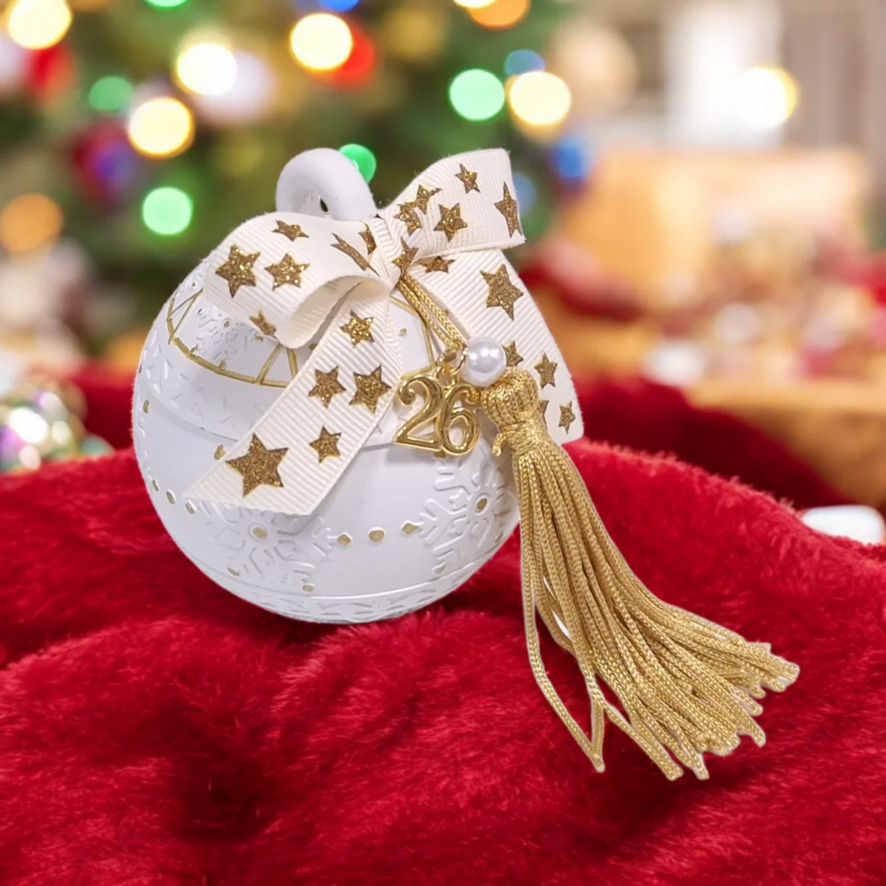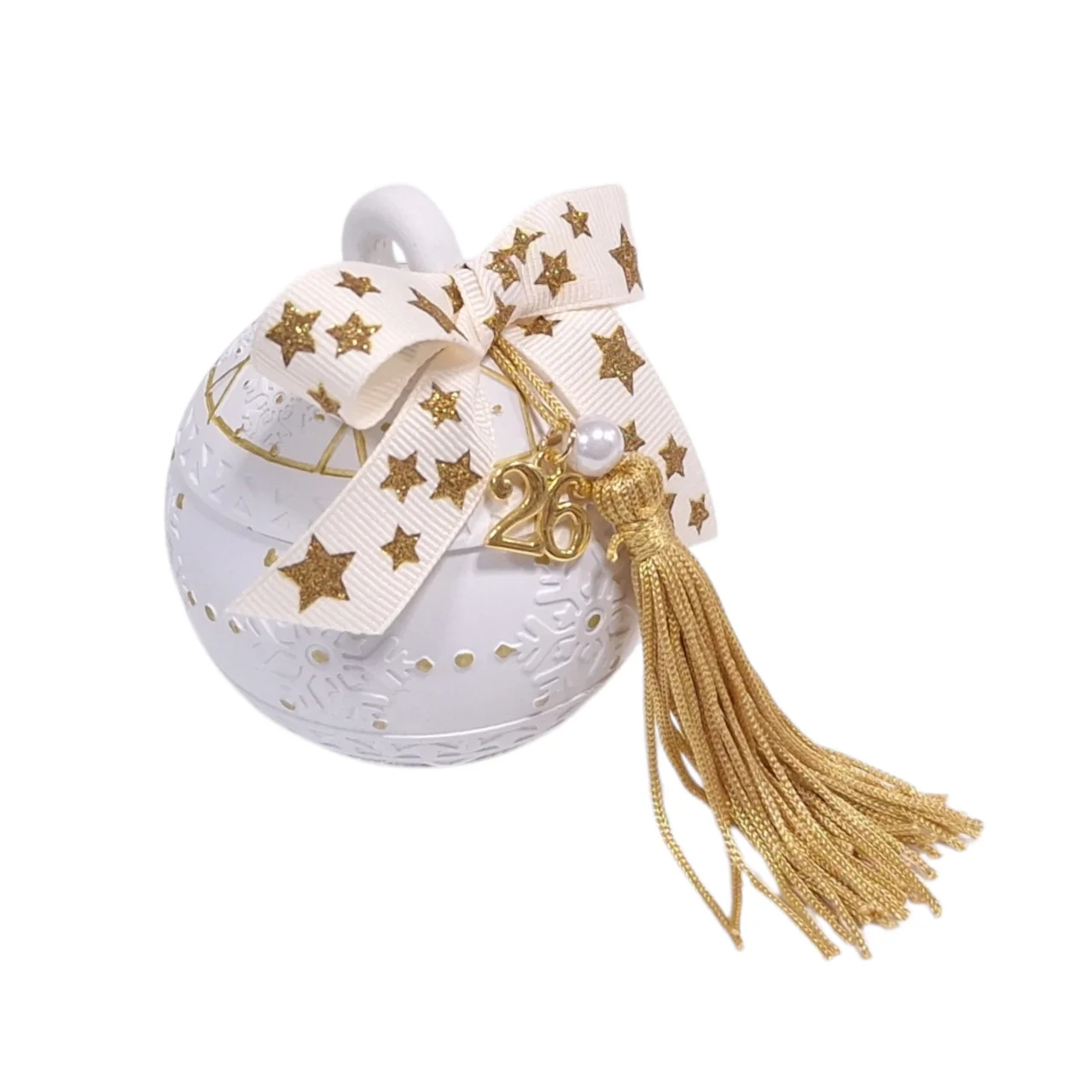 Χριστουγεννιάτικη διακοσμητική μπάλα με ρεσό με ανάγλυφες χιονονιφάδες εξωτερικά σε λευκές-χρυσές αποχρώσεις φτιαγμένη από σκόνη πορσελάνης.